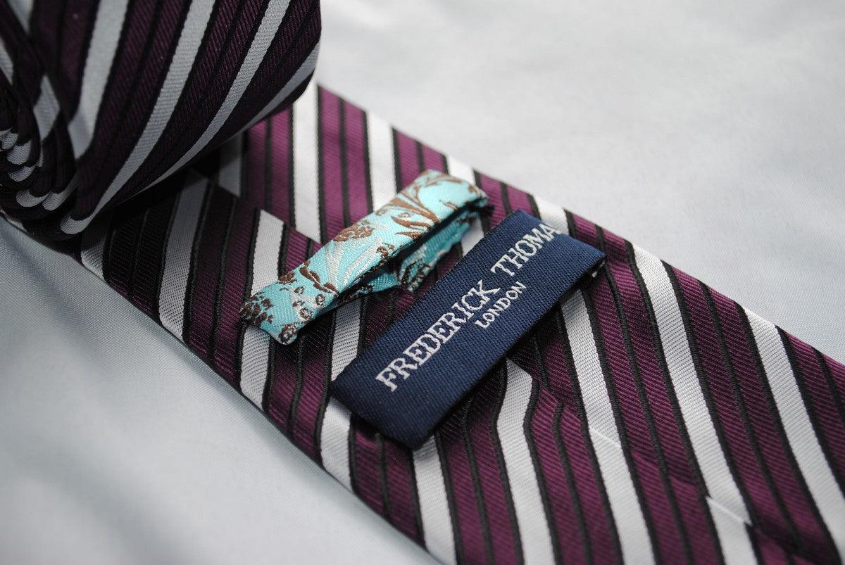Frederick Thomas handmade striped tie with signature floral pattern design to rear.